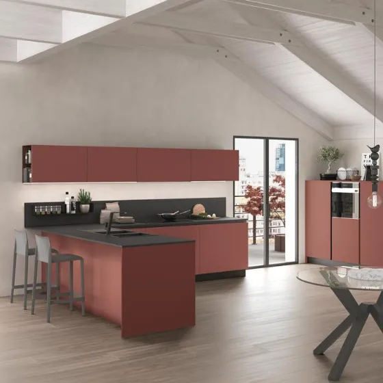 Crea la tua cucina moderna a Pesaro con il design e l'estetica unici di questo modello. Il corpo avanzato delle basi, l'effetto pietra del top e le mensole in diverse finiture materiche danno carattere alla composizione. Scegli la cucina per esprimere la tua personalità e il tuo stile unico.